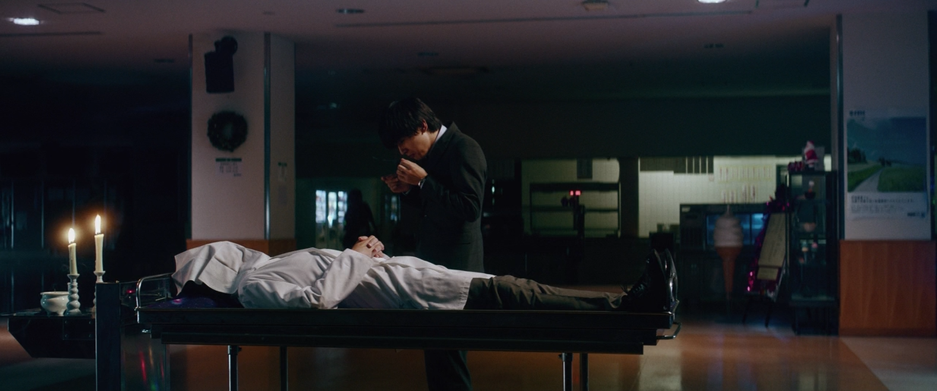 The composition of Not Quite Dead Yet – a straightforward composition that offers a mix of fixed shots and dynamic shots (i.e. tracking moments as well as spatial moving moments), stands out due to compositional snappiness. This compositional snappiness is instrumental in creating a pleasing flow within scene-compositions. The composition is furthermore decorated with lighthearted visual sequences, e.g. the animated bento sequence as well as visual style of the flashbacks, and, to aid the comedy, a lighthearted use of non-diegetic sounds.