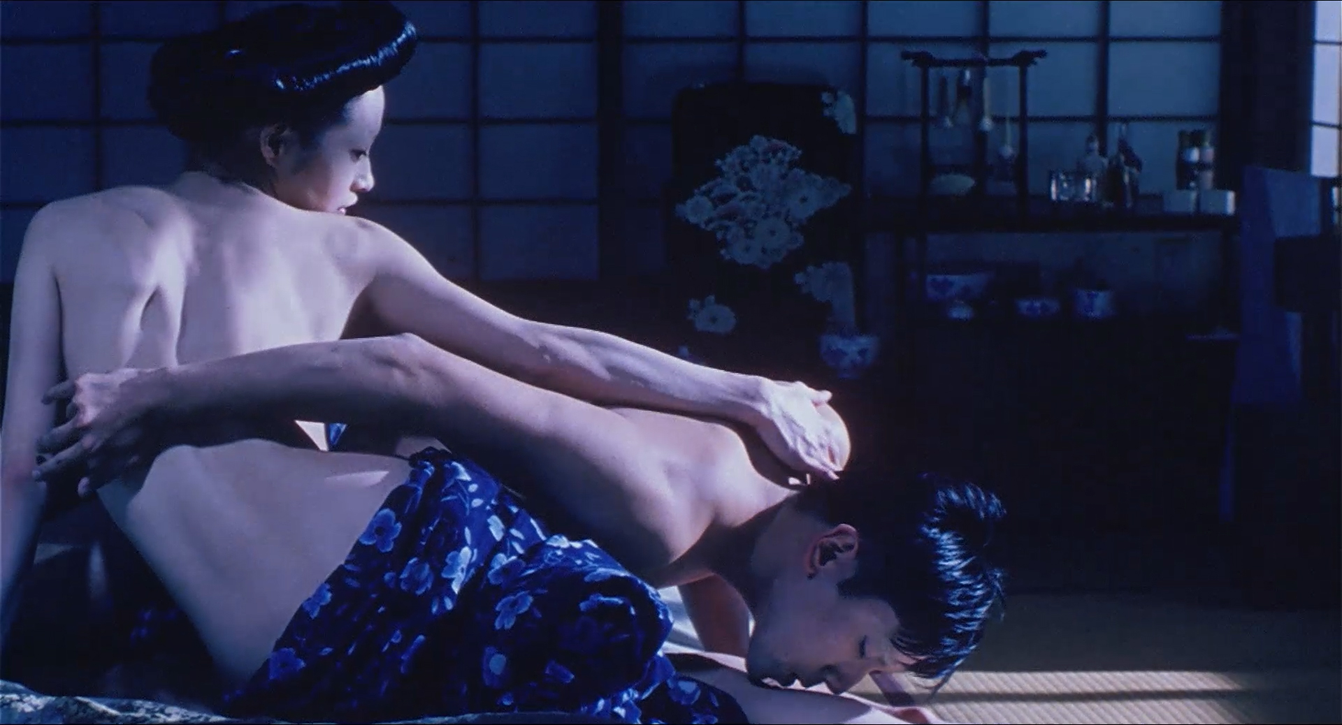 Moreover, to engender an unsettling and ominous atmosphere, Tsukamoto also relies on the colour/lighting design. While the lighting design, i.e. the play between light and shadow, is exploited for atmospheric effect in a straightforward manner, Tsukamoto utilizes the colour-design in a more expressive manner. The expressive use of colour-design is evident in the alternation between sequences with a realistic colour palate and sequences with a warm yellowish tinge. The yellowish colour-scheme, by adding a very prominent visual warmth to the certain scenes, subtly expresses that both Yukio and Rin consider their current marital life as being ideal – this colour palate echoes, in other words, the satisfaction they feel in their marriage.