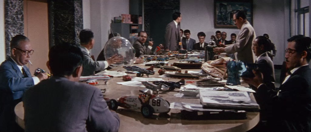 The conflict between Goda’s own desire and the corporate demand is not only unveiled via the cinematographical composition as such but is also foreshadowed by kind of speech that supports Masamura’s comedy. The unfolding of Giants and Toys is driven by a kind of restless speech, a fast-paced speaking that is determined by the pressure of the viscous rivalry between corporations and the oppressive demand to produce results and profit for the company’s boss.