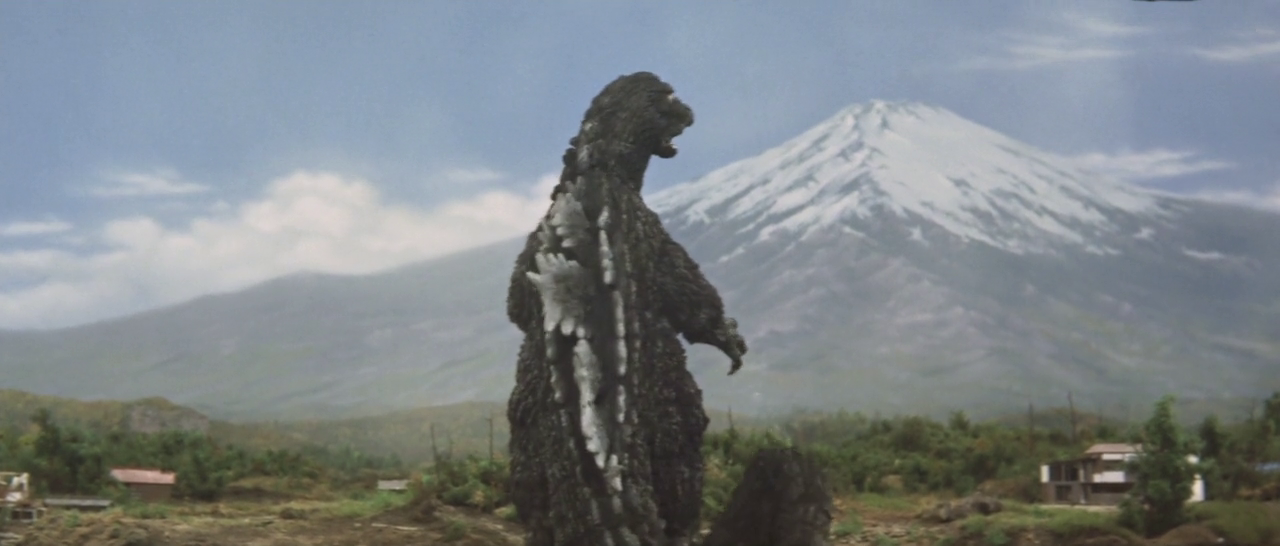 There are three decontextualized or decentred events within the narrative: the resurfacing of Rodan (Masanori Shinohara), the appearance of Godzilla (Haruo Nakajima), and their fight near mount Fuji. In our review of Rodan (1956), we argued that this flying Kaiju embodied the destructive finality of a blind economic growth on the planet – the destruction it caused echoing the environmental destruction that the capitalistic Japanese Other was blindly producing. Even though in Ghidorah, the Three Headed Monster (1964), there is no societal dynamic that explains his sudden bursting forth from the crater of mount Aso, we should nevertheless read his presence as a visualization of the rejected post-war capitalistic truth – he is the victim of the blossoming capitalism, the embodiment of the environmental trauma that blind belief and adherence to such logic ends up causing (Narra-note 1, Narra-note 2). Godzilla, whose sudden appearance also lacks any reference to the societal field, is present as the victim of pre-war Japanese imperialism. He embodies the imperialistic trauma, the traumatic stain that refuses to be erased from the Japanese Other.