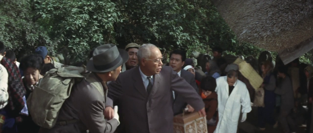 Yet, the reason for this anthropomorphising is quite clear – i.e. to allows the spectator to more easily sympathize with them, to accept their shift from antagonist to hero. This also explain why neither Rodan and Godzilla cause a trail of destruction (e.g. the birth of Rodan from the crater is followed by merely two shots to illustrate the power of his wings). While the absence of such decorative shots of destruction can also be partially blamed on the fact the film was rushed into production to replace Red Beard in Toho’s New Year’s holiday slate, the choice fits within the attempt to re-frame these monsters from enemies that threaten to Japanese society to protectors of the fictional Japanese societal harmony. As a matter of fact, within the narrative, only king Ghidorah causes a kind of destruction that worthy of the name – a sequence that is breathtaking and will satisfy anyone thirst to see miniature cityscapes explode and crumble to pieces.