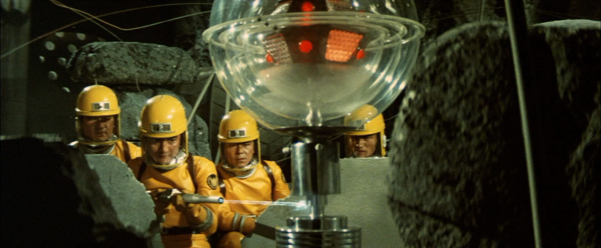 Not long after her arrived, Kyoko receives a call from Katsuo Yamabe (Akira Kubo), who recently joined a team of researchers on the moon base of the United Nations Science Committee (UNSC). Their call is cut off when, suddenly, the electricity fails – all contact is lost. Once the power is restored, a mysterious poisonous gas spreads through the base of operations and envelops the whole of monster island. Dr. Yoshida (Jun Tazaki), who works for the UNSC, immediately launches an investigation, yet before his team can analyse this problematic situation, the world’s biggest cities are attacked by the kaiju that inhabited the island.