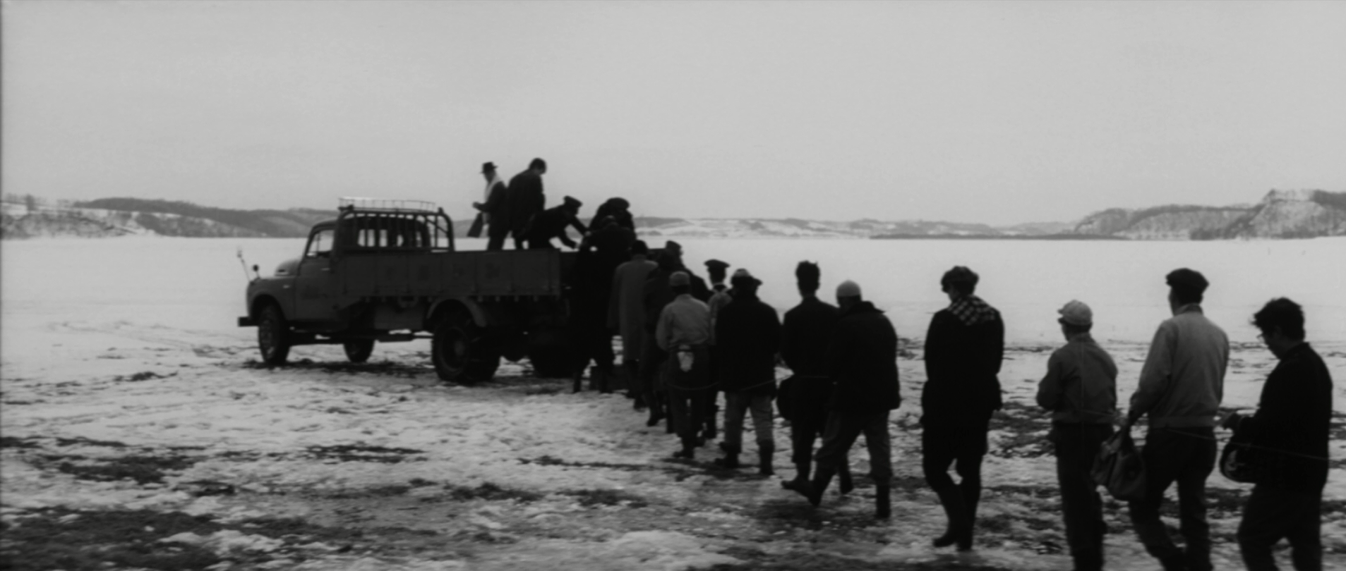 The monochrome colour-palette is put to great use by Ishii and Yoshikazu Yamasawa. By exploiting the whiteness of the snowy environment to turn characters, vehicles, and so on into black silhouettes, they succeed in emphasizing the crafted compositional tensions and heighten the visual pleasure of many shots for the spectator (Cine-note 1).