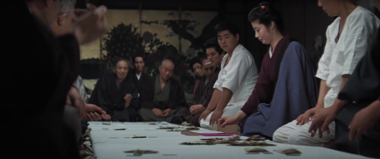 Whether Tai Kato’s narrative can offer a fresh perspective mainly depends on how Suzuki reshuffles the three interrelated thematical oppositions: between giri and ninjo, the patriarchal Other and the capitalistic threat, and between desire and the a-subjective enactment of the moral calculations. To start unfolding the thematical layers of Red Peony Gambler 3: Flower Cards Game, we first need to unveil the way the capitalistic threat rears its head within the societal field structured by the patriarchal Other.